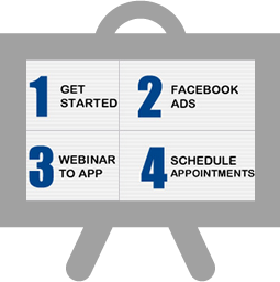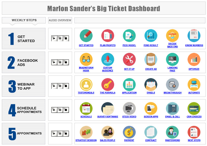 You follow the simple, easy steps. Then you go to icon two. Each icon is designed to take 20-60 minutes, more or less. Next thing you know, you've got a whole system set up to get leads, do automated webinars, collect applications, automatically have appointments set -- and get the big ticket money.